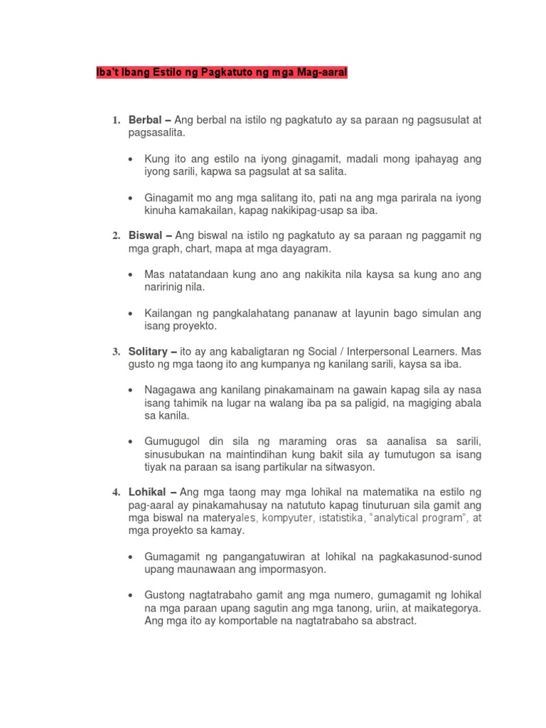 Alin ang higit na makakatulong sa pagkatuto ng mag aaral. Bilang pangkalahatan anumang paraan ang ginagamit ng mga guro ang mahalaga ay ang istilo ng pagkatuto ng mag-aaral na siyang tumutukoy sa kaparaanan nila ay mas higit sa gusto ng mga mag-aaral para sa kanilang pag-aaral. Ang bawat yunit ay nahahati. Kukuha ang mga lider ng binilot na papel mula sa loob ng tambiolo.
