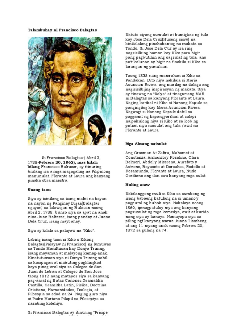 Ang talambuhay ni francisco balagtas. Ang Talambuhay ni Francisco Balagtas Baltazar Si Francisco Baltazar ang tinaguriang magiting na makatang Pilipino ay isinilang sa isang maliit na nayon sa Panginay bayan ng Bigaa sa lalawigan ng Bulacan noong ika-2 ng Abril 2 1788. Ang Florante at Laura ay isang Obra Maestra na itinuturo sa ikawalong baitangAnomang mga pagkakamali sa pagbabaybay o pagbigkas at iba pa ay hindi sinasadya. Ang Talambuhay ni Francisco Balagtas Baltazar Si Francisco Baltazar ang tinaguriang magiting na makatang Pilipino ay isinilang sa isang maliit na nayon sa Panginay bayan ng Bigaa sa lalawigan ng Bulacan noong ika-2 ng Abril 2 1788.