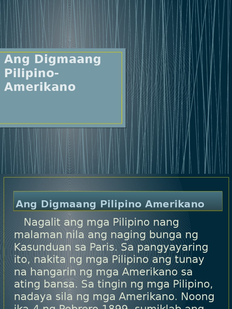 Ang Digmaang PilipinoAmerikano Ingles. Napagbabago nito ang pananaw ng isang indibidwal at napapamahal siya sa kultura ng bansang nanakop. Ano ang Sanhi ng Digmaang Espanyol-Amerikano.