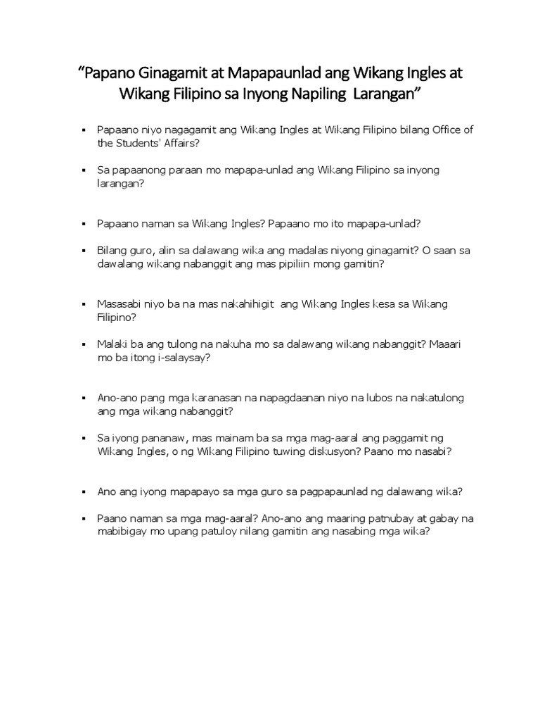 Panayam Paano Mapauunlad Ng. Ang Filipino Bilang Wikang Pambansa. Ibig sabihin wika na ng bayan ang wikang Filipino.