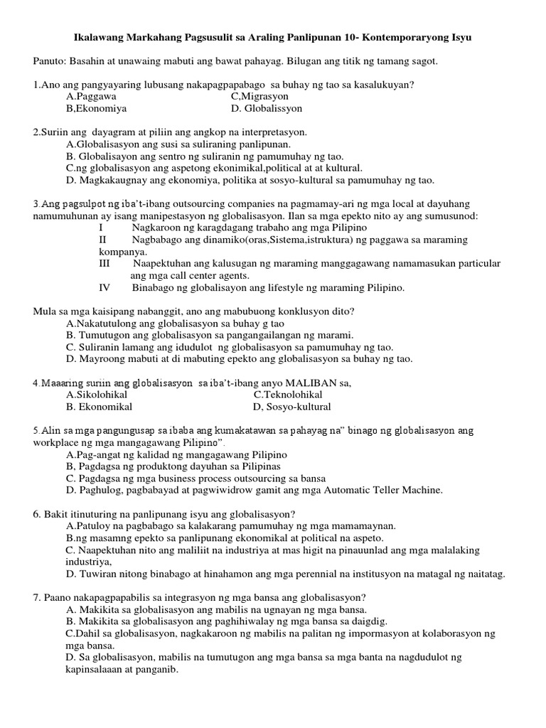 AP10 SAN ISIDRO NHS IKALAWANG MARKAHAN 2. Ang Kalagayan ng Filipino sa Panahon Ngayon. Ano ang kaibahan ng trabaho sa hanapbuhay magbigay ng halimbawa at ipaliwanag ito.